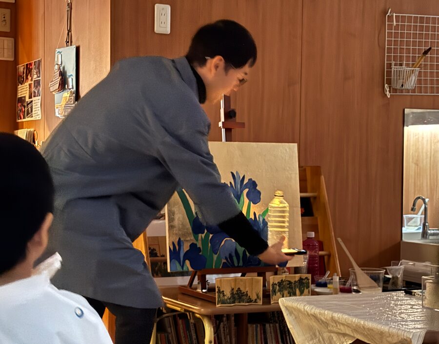 日本画を前にすると、「金色にひかっていて不思議!」と、じっと見入る姿も。
