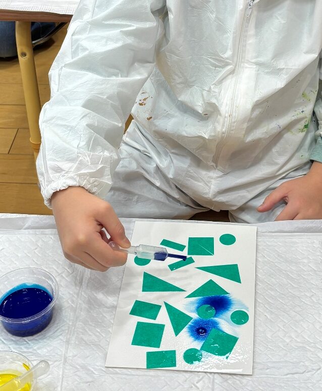 マスキングテープを貼り、大きな刷毛で紙にたっぷりと水を含ませたあと、スポイトで絵具を垂らしていきます。すると、色がじわーっと広がっていく様子が現れ、その動きを楽しみながら表現を進めていきました。