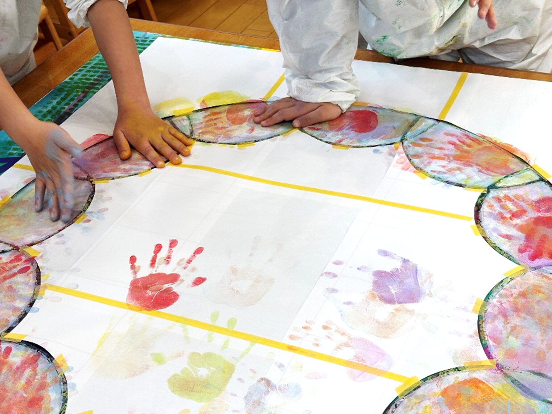 マスキングされていない部分に、絵の具で手形スタンプを押していきます。