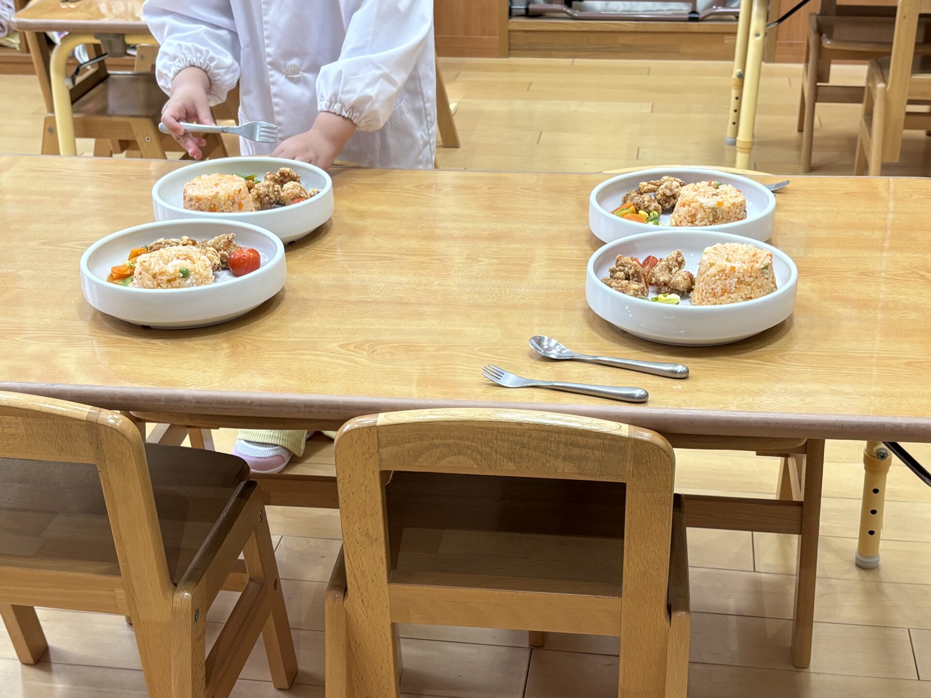 近隣のお店から届く新鮮な食材を使い、園内で調理を行っています。子どもたちは、食材にふれたり、料理や盛り付けたりする中で、「食事を楽しむ」ことを目的として食への関心を自然と育んでいきます。地域の方々とのつながりを大切にし、食材を届けてくださる方への感謝の気持ちを育みます。