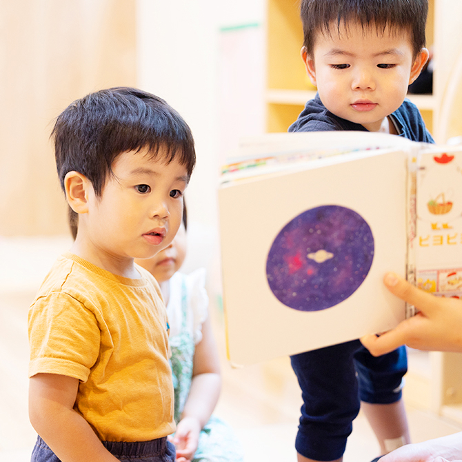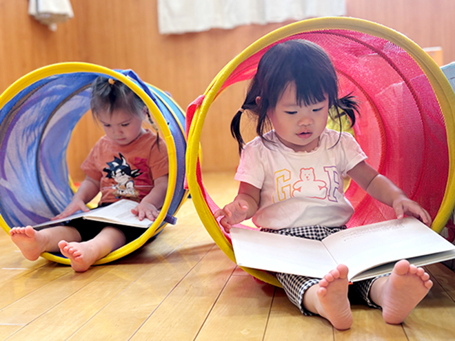 季節の絵本や子どもの発達に合ったよい絵本を選び、読み聞かせをする事を大切にします。絵本は、子どもの想像力を育てます。また子ども自らが遊びたいと思える主体性を大切にし、ひとりひとりの子どもが生き生きと遊べる環境を目指します。