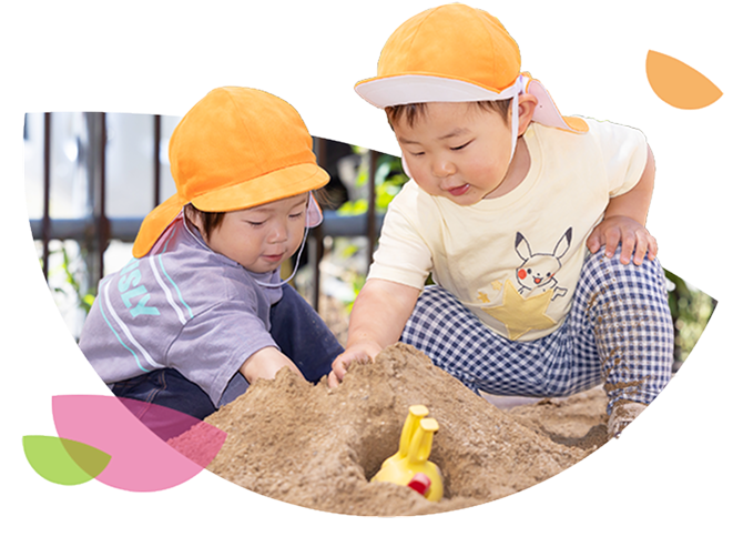 0~2歳児には育児担当制で安心を育み、絵本や遊びの環境で「やってみたい」気持ちを広げ、幼児期には楽しい体験プログラムで心と体の成長を育みます。