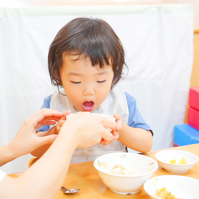 0~2歳児クラスに育児担当制を導入し、特定の保育士が継続して子どもたちの育児を担当します。「いつものお世話をしてくれる特別な大人」がいることで、子どもは園生活に慣れやすくなり、心穏やかに安心して過ごすことができます。