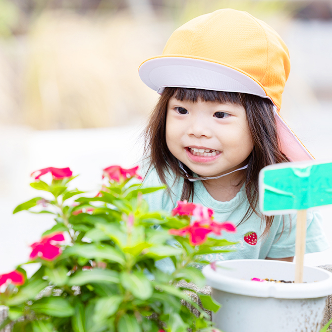 園庭では、時期に合わせて栽培や季節の花を植えて育てています。季節の移ろいを感じながら自然と触れ合うことができ、虫との出会いなど、日々の生活の中にたくさんの発見があります。